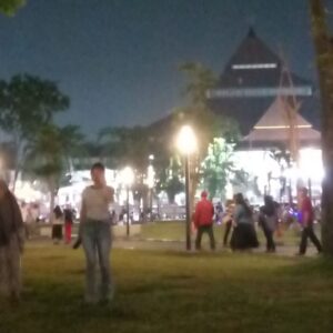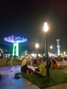 Sejak malam hari, warga dari berbagai daerah tampak memadati kawasan alun-alun. Anak-anak bermain di area terbuka, sementara orang tua menikmati suasana santai di sekitar taman dan fasilitas umum yang tersedia.