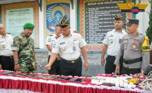 Tanggamus Lapas Kota agung – Bersama TNI Polri, Lembaga Pemasyarakatan (Lapas) Kelas IIB Kotaagung musnahkan barang sitaan hasil razia periode April sampai dengan Desember 2025 yang dilaksanakan pada Selasa (27/01/2026). Kegiatan pemusnahan berlangsung di halaman utama Lapas Kotaagung yang dihadiri oleh Kasat Polisi Pamong Praja Polres Tanggamus, Dandim 0414/Tanggamus, serta perwakilan dari Dinas Hukum dan Hak Asasi Manusia Kabupaten Tanggamus.
