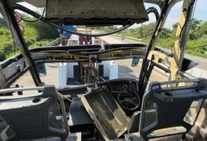 Setibanya di lokasi, petugas mendapati kondisi bus mengalami kerusakan parah pada bagian kabin depan sebelah kiri. Pecahan kaca berserakan dan pintu bus mengalami kerusakan akibat ledakan yang diduga berasal dari area bawah kursi sopir. Selain itu, tercium bau menyengat menyerupai bahan petasan dari dalam kabin.