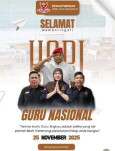 Selasa, (25/11/26) Dewan Pimpinan Cabang Gerakan Rakyat Indonesia Bersatu Jaya (DPC GRIB Jaya) Kabupaten Sidoarjo, di bawah kepemimpinan Selamet Joko Anggoro, turut memperingati Hari Guru Nasional (HGN) yang jatuh pada tanggal 25 November 2025. Peringatan ini menjadi momentum bagi organisasi masyarakat (ormas) tersebut untuk menyampaikan apresiasi tertinggi kepada seluruh guru atas dedikasi tanpa batas dalam mencerdaskan kehidupan bangsa.