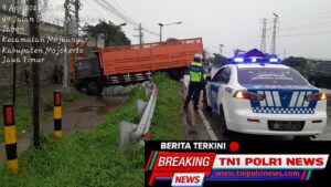 MOJOKERTO – Diduga akibat menghindari mobil pribadi yang oleng dari arah Surabaya, truk muatan yang berlawanan arah dari mojokerto-surabaya akhifnya terpelanting kekiri hingga keluar dari pagar jalan hingga terhenti karena menabrak gardu listrik yang berada pinggir jalan area bypass jabon Mojokerto hingga menutup seperempat akses lalu lintas sore tadi 09/04/2026