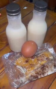 Paket menu yang dibagikan terdiri dari piscok (pisang cokelat), telur rebus, dan sebotol susu kedelai.