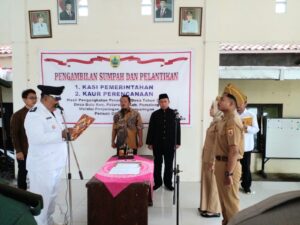 Upacara pengambilan sumpah jabatan yang dibacakan Kepala Desa Muhtar, S.H., M.H, dan ditirukan oleh Titin Putri Maimunah, S.H selaku Kasi Pemerintahan dan Rahmania Yudha, S.H selaku Kaur Perencanaan.