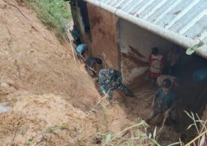Esok harinya pada Hari Sabtu, pukul 06.10 Wib Babinsa bersama warga melakukan karya bakti pembersihan material longsor yang menimp rumah korban.