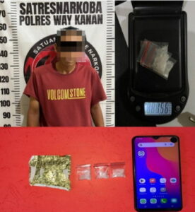 Saat ini tersangka berikut barang bukti kertas timah rokok, 3 (tiga) bungkus plastik klip ukuran kecil di dalamnya berisikan kristal putih yang diduga narkotika jenis sabu dengan berat bruto 1,56 gram dan Handphone warna Starry Black merek “Vivo Y91” diamankan ke Satresnarkoba Polres Way Kanan untuk dilakukan pemeriksaan lebih lanjut.