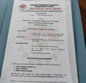 Penyerahan mandat kepengurusan Dewan Pimpinan Daerah (DPD) II Pemuda Karya Nasional (PKN) Kabupaten Karo, berlangsung khidmat dan penuh semangat pada Jumat, (24/4/2026). Acara ini digelar di Jalan Letnan Mumah Purba, Ruko Tasima, yang kini resmi menjadi Sekretariat DPD II PKN Kabupaten Karo.