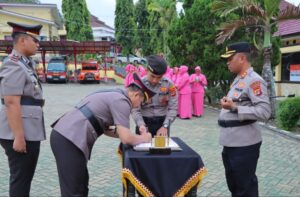 Upacara Sertijab diakhiri dengan penandatanganan berita acara, pemberian ucapan selamat, serta acara kenal pamit antara pejabat lama dan baru di Aula Paramasatwika Polres Tanggamus. (N.Heriyadi)