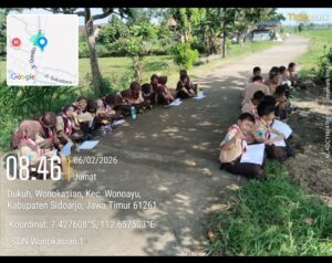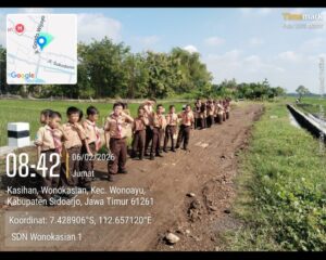 Sidoarjo — 06-02-2026 SDN Wonokasian 1 yang berlokasi di Dukuh Wonokasian, Kecamatan Wonoayu, Kabupaten Sidoarjo, Jawa Timur, melaksanakan kegiatan pembelajaran luar kelas di area permukiman sawah. Kegiatan ini bertujuan untuk mengenalkan peserta didik pada lingkungan alam sekaligus menanamkan rasa cinta dan tanggung jawab terhadap ciptaan Tuhan Yang Maha Esa.