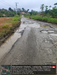 Tanggamus – Ruas jalan Provinsi Lampung di Kabupaten Tanggamus menuju Lampung Barat yang rusak parah kini di tagih komitmennya oleh masyarakat Pekon Gunungtiga, Kecamatan Ulubelu atas janji Dinas Bina Marga dan Bina Konstruksi (BMBK) Lampung, Senin (20/10/2025).